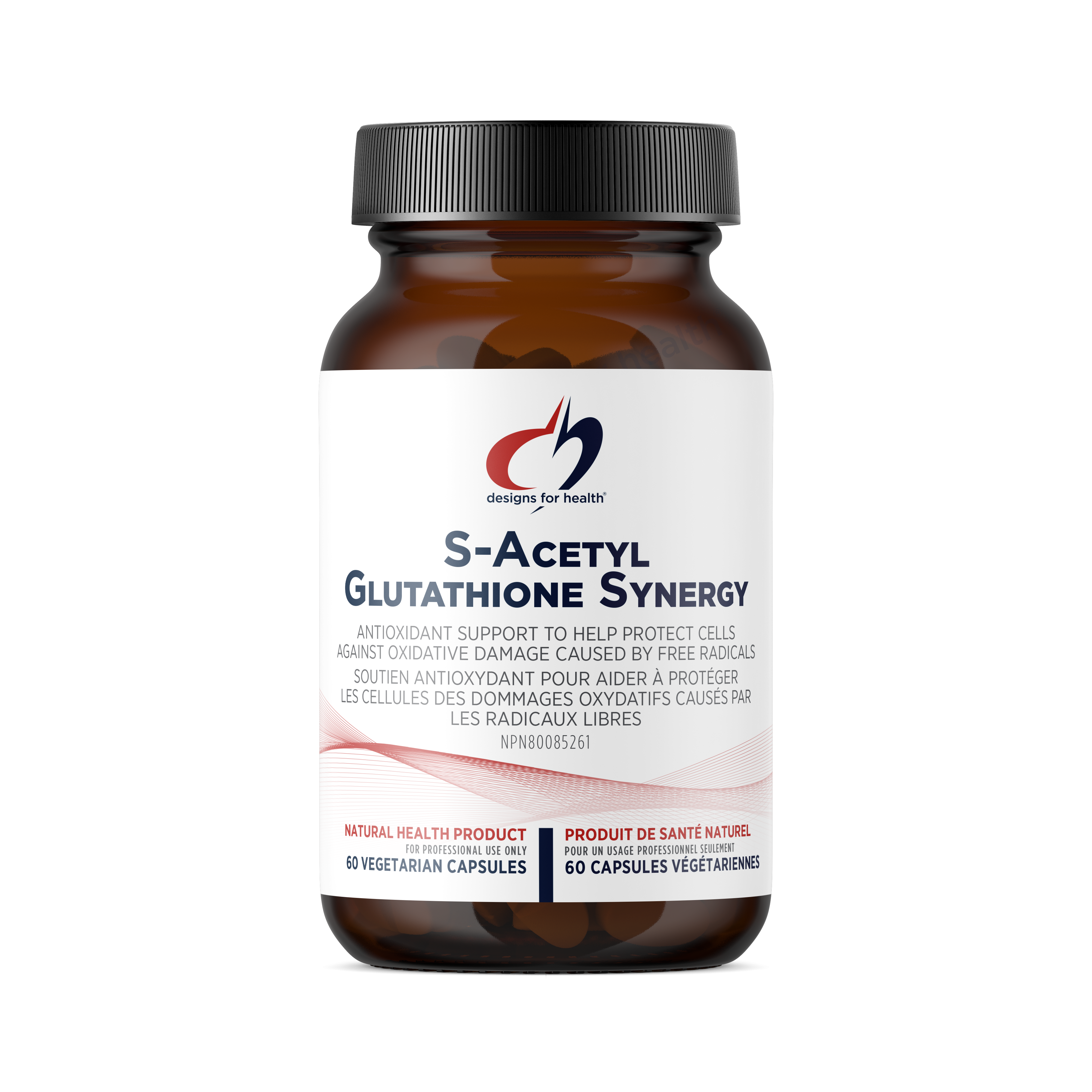 S-Acetyl Glutathione Synergy (S-A-GSH) est une forme unique de glutathion, l'un des antioxydants les plus puissants produits naturellement par l'organisme. Un groupe acétyle (COCH3) est attaché à l'atome de soufre de la cystéine dans la molécule de glutathion. Le S-A-GSH est bien adapté à l'ingestion orale car ce groupe acétyle protège le glutathion de la dégradation dans le tractus gastro-intestinal. Une fois absorbé et à l'intérieur des cellules, il est éliminé, laissant la molécule de glutathion intacte. Le S-A-GSH contribue à soutenir la fonction immunitaire et à optimiser les voies de détoxification hépatique dépendantes du glutathion. C'est le choix idéal lorsque des doses plus élevées de glutathion sont recommandées. Ce produit contient également de la N-acétyl-L-cystéine (NAC) et de la vitamine B6, toutes deux importantes pour la production de glutathion.