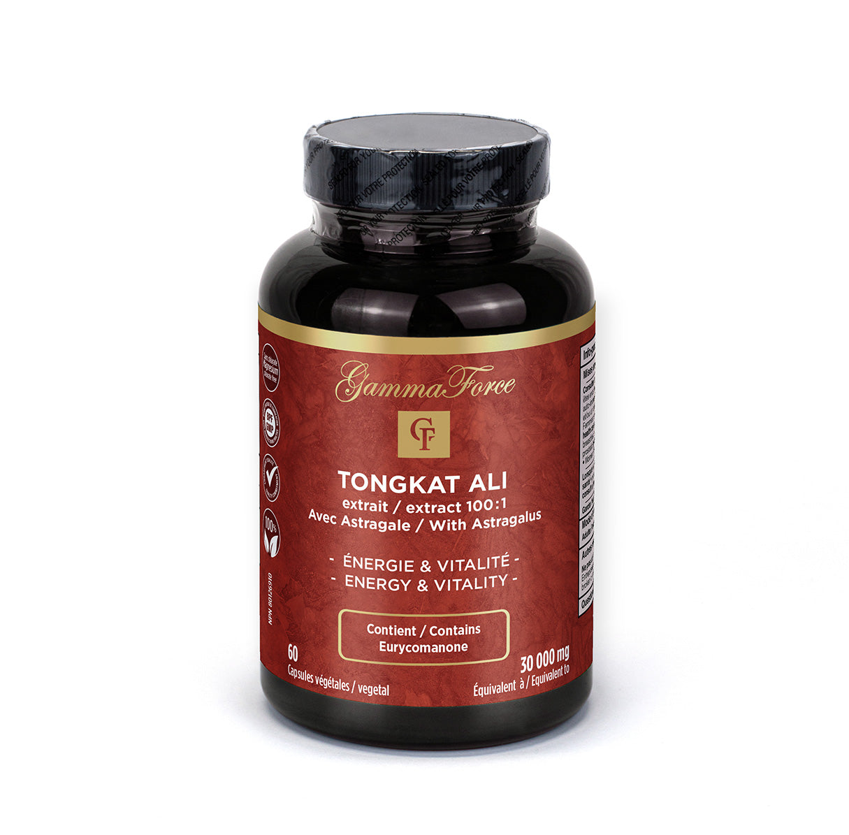 Gamma Force a sélectionné avec soin un extrait de Tongkat Ali dont le ratio est stable à 100:1, fournissant un minimum de 1 % à 1,3 % d’eurycomanone. Le tout est combiné avec un extrait 20 :1 de racine d’astragale. Chaque capsule contient l’équivalent de 30 000 mg de racine séchée de Tongkat Ali offrant une concentration optimale de toutes les molécules actives de la racine et l’équivalent de 2 000 mg de racine séchée d’astragale.